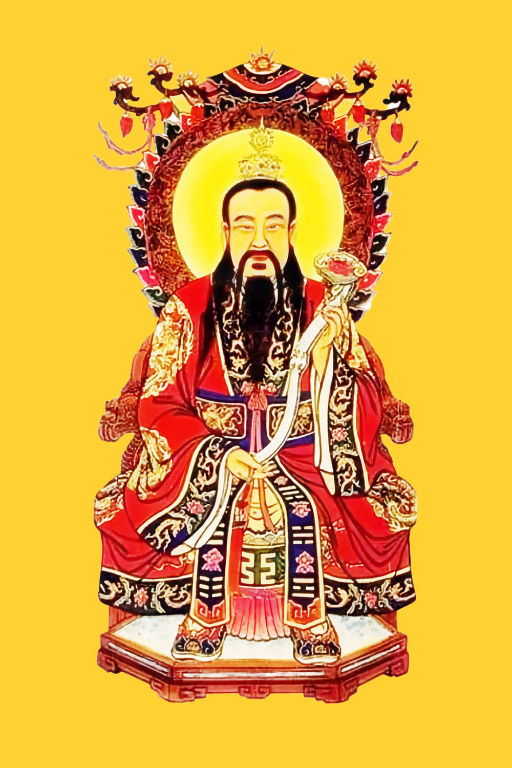 In some Taoist scriptures, the Tai Chi diagram he holds represents his authority over the regulation of yin and yang.